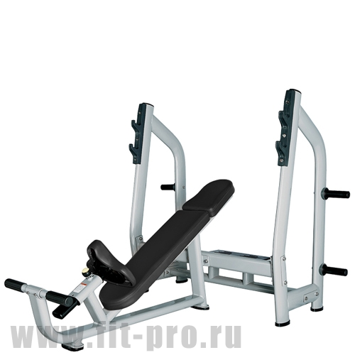 Скамья для жима с положительным наклоном для коммерческого использования. Упоры для ног. Регулируемое сиденье. 4 держателя для дисков. Цвет рамы - серебро. Цвет обивки - черный.